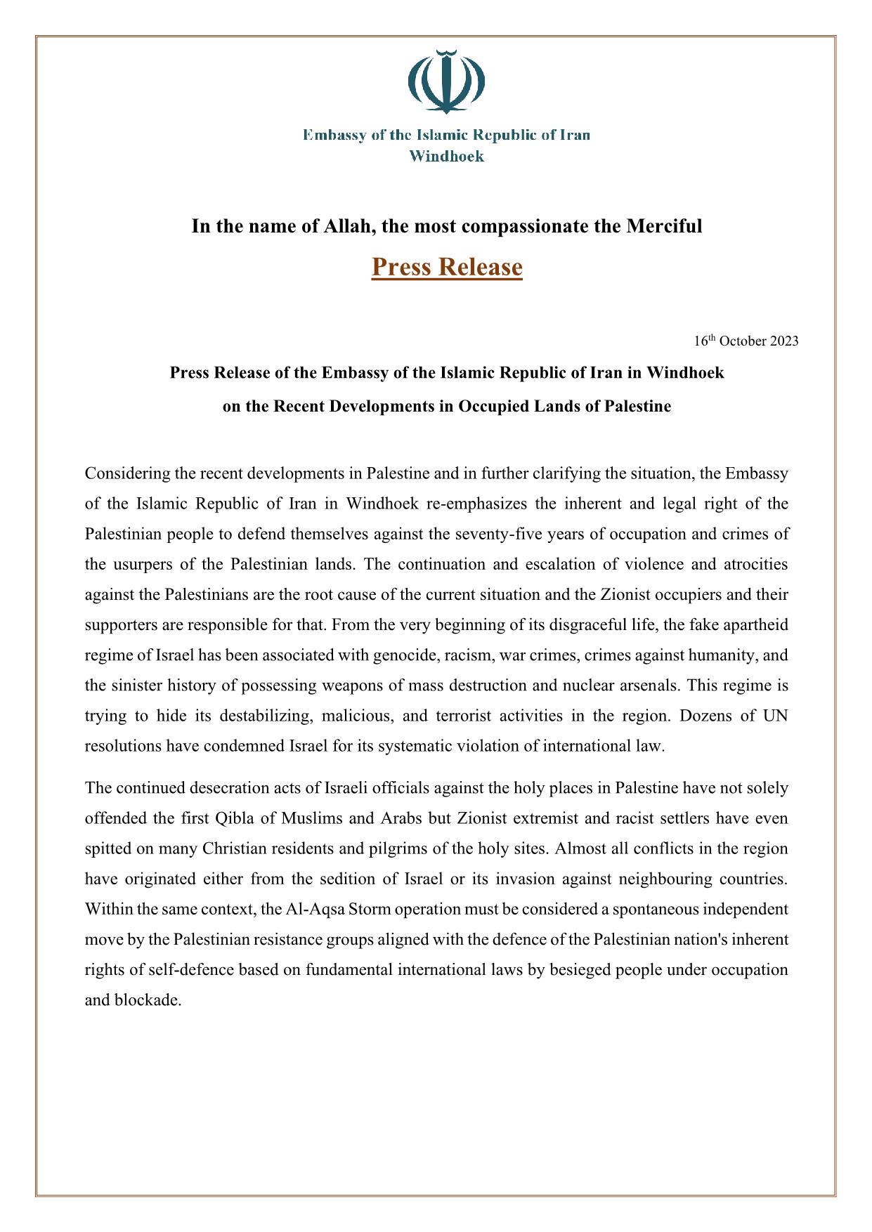 Press Release: On the Recent Developments in Occupied Lands of Palestine