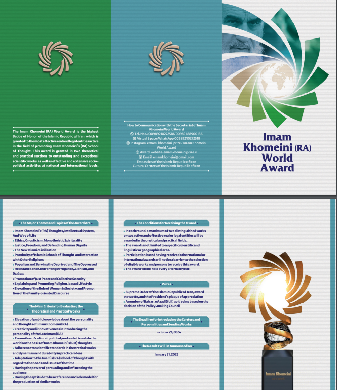 The First Imam Khomeini World Award has announced a call for submissions to honor and promote the ideals of Imam Khomeini the founder of the Islamic Republic of Iran. This international cultural and academic event is aimed at recognizing scholars researchers and activists who work towards the realization of Imam Khomeini’s visions.