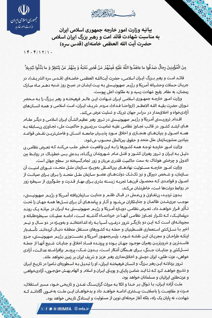 بیانیه وزرات امور خارجه جمهوری اسلامی ایران به مناسبت شهادت قائد امت و رهبر بزرگ ایران اسلامی، حضرت آیت‌الله العظمی خامنه‌ای (قدس سره الشریف)